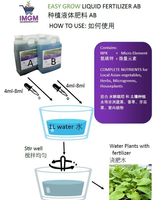 Easy Grow 液体肥料由两部分组成:肥料 A 和 肥料 B。此双组分配方可确保所有必需养分保持稳定,易于植物吸收,从而实现最佳生长效果。配方中包含所有主要植物养分,有助于植物健康、茂盛地生长。