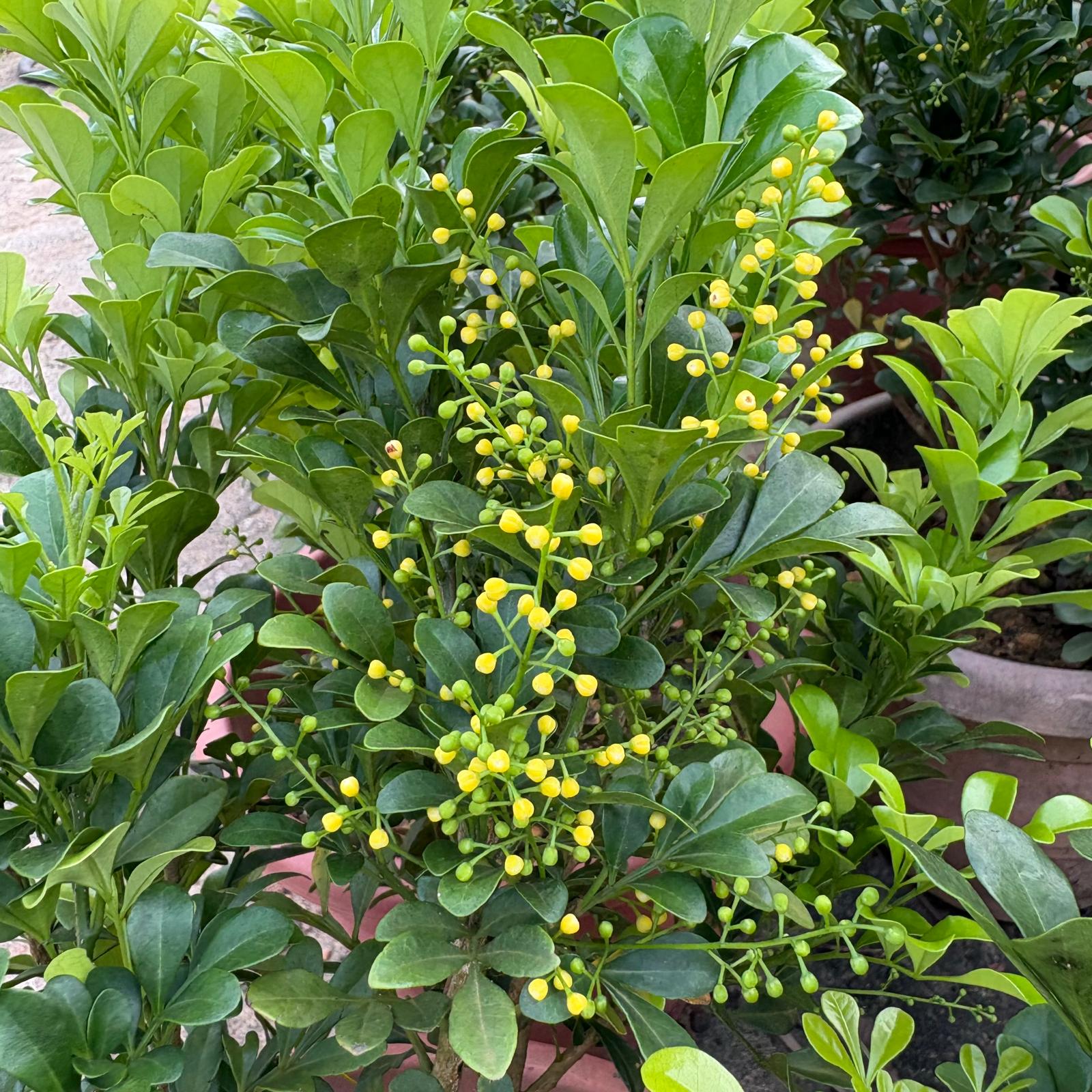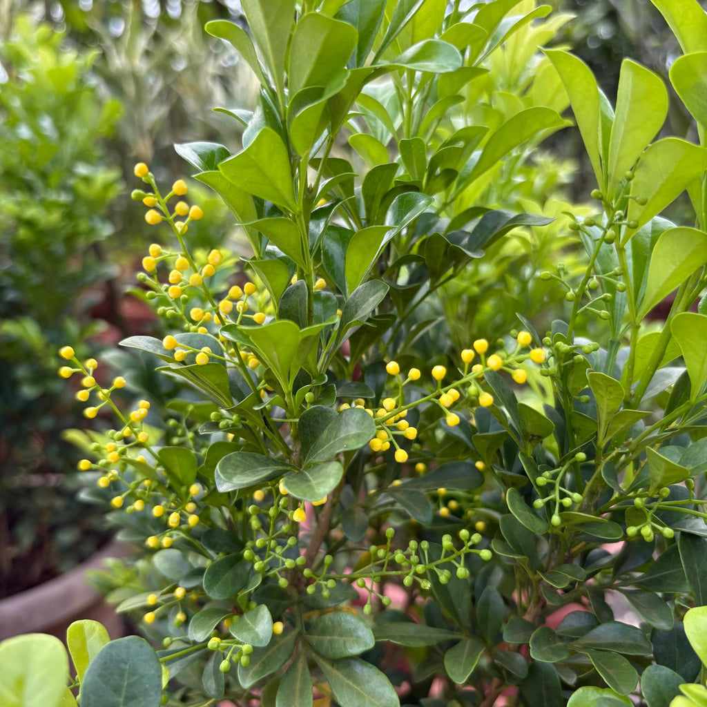 Yellow, fragrant flowers are arranged in an inflorescence known as a thyrse. Large shrub or small tree with highly branched crown, able to grow up to tall.