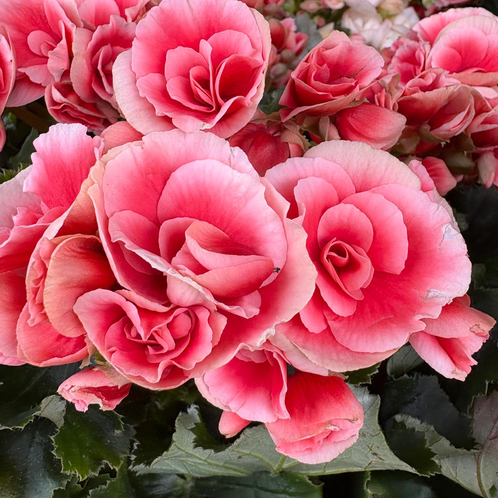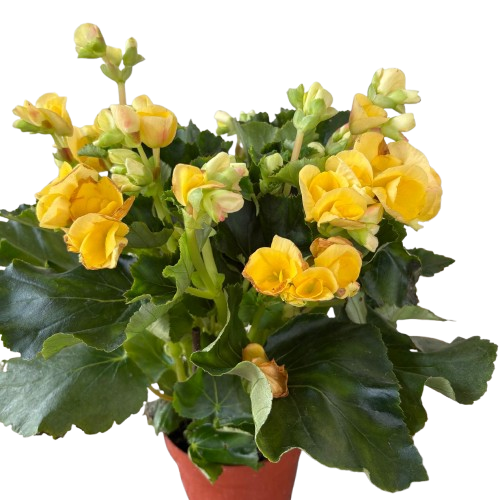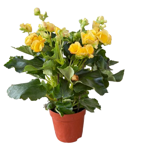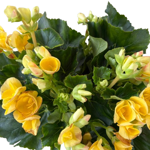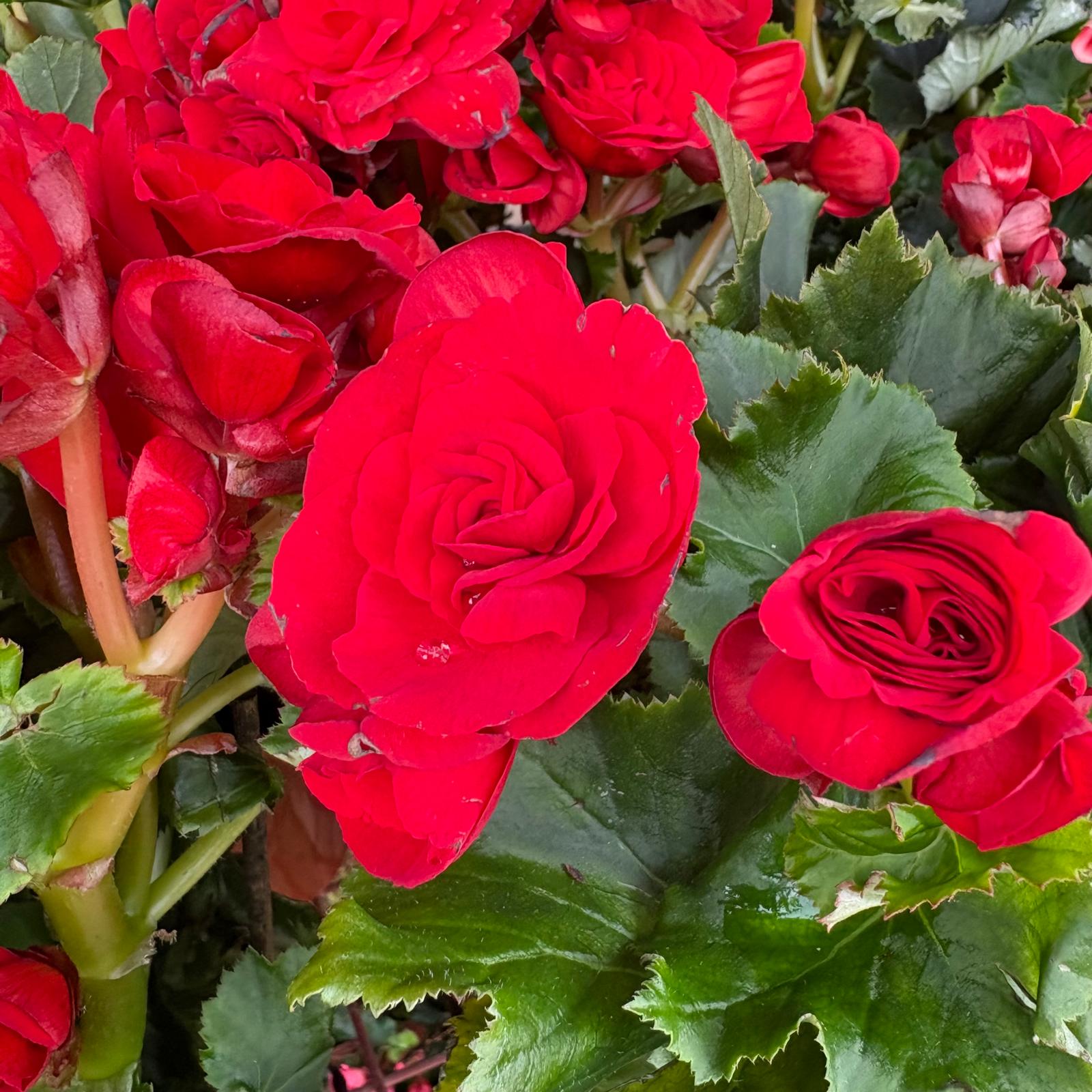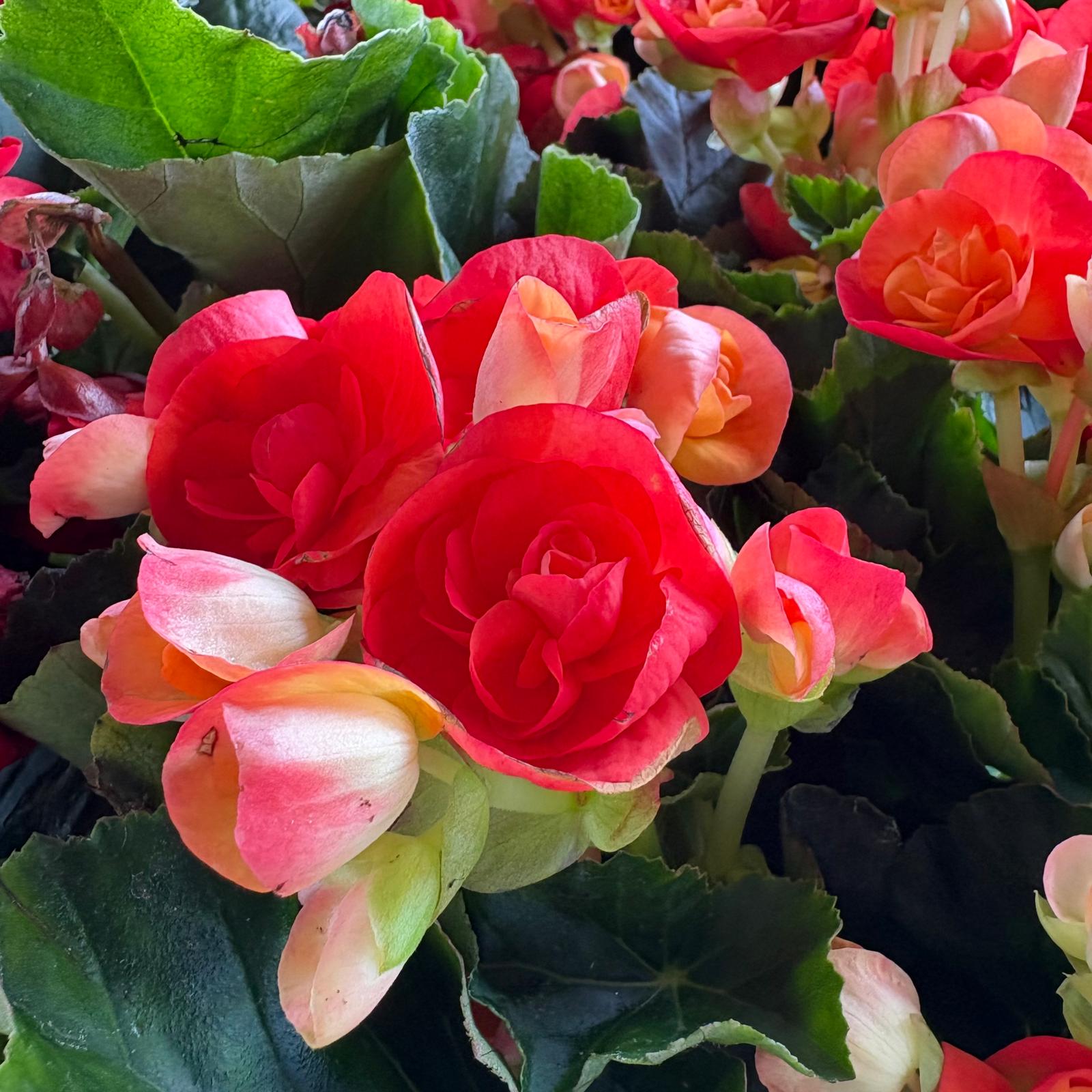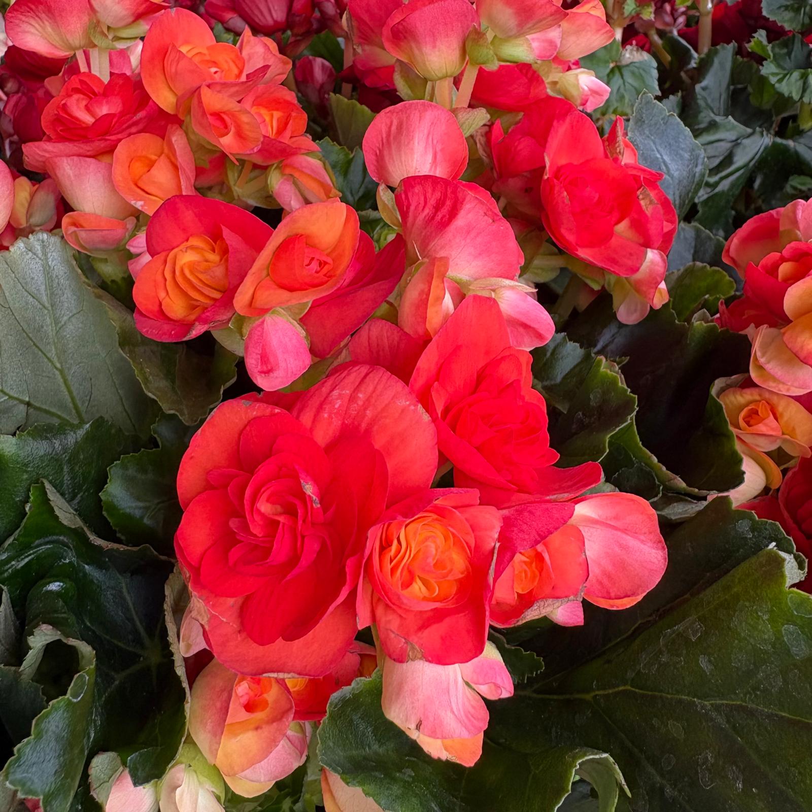 Tuberous Begonias produce vibrant, often double or ruffled flowers in a wide range of colors, including red, orange, yellow, pink, and white. The blooms can be quite large, sometimes reaching several inches in diameter. The plant has succulent stems and often asymmetrical, heart-shaped leaves that are typically green but can also have bronze or reddish hues.
